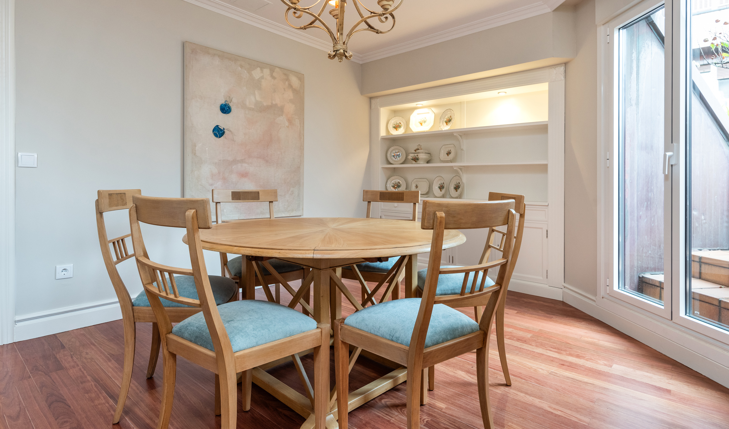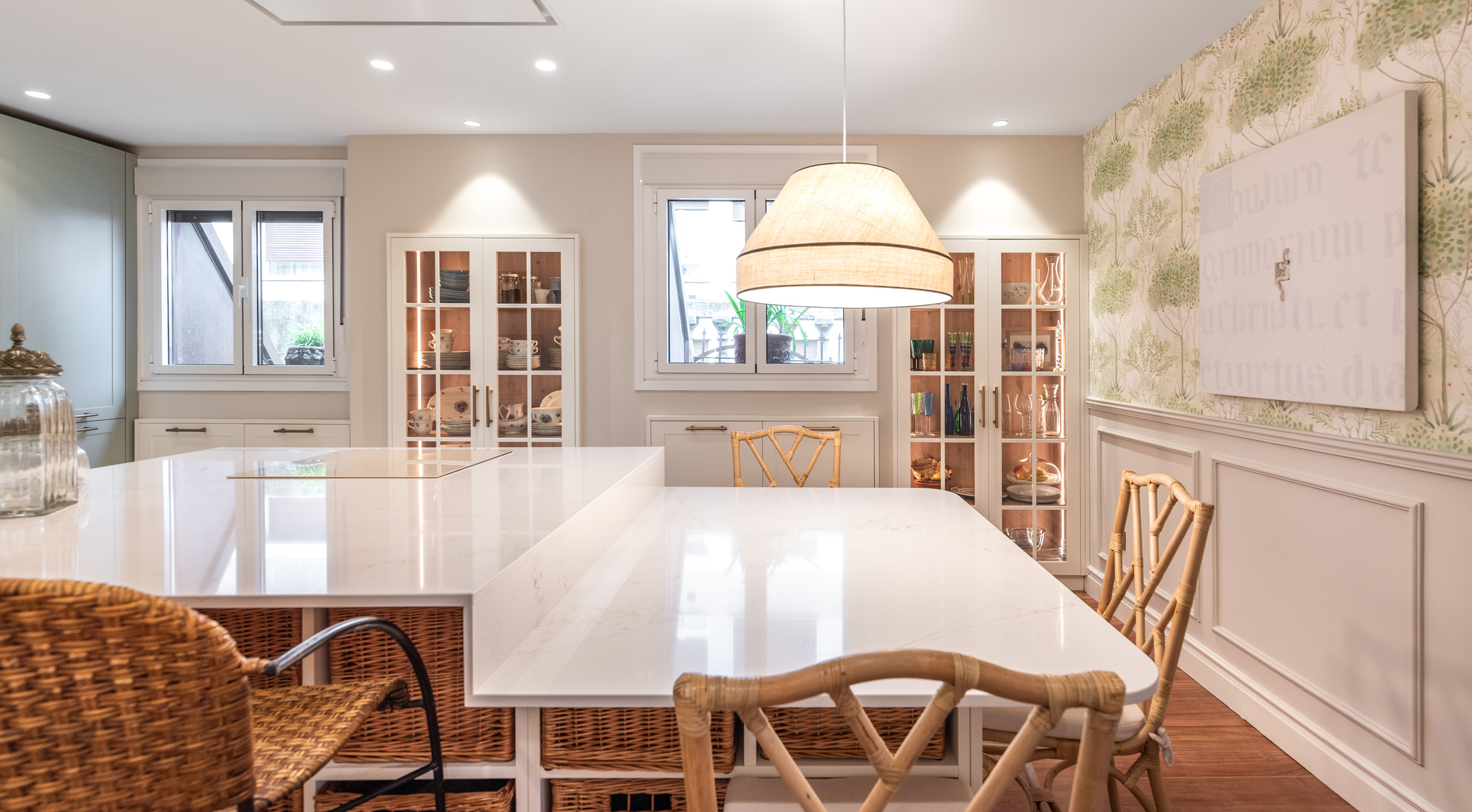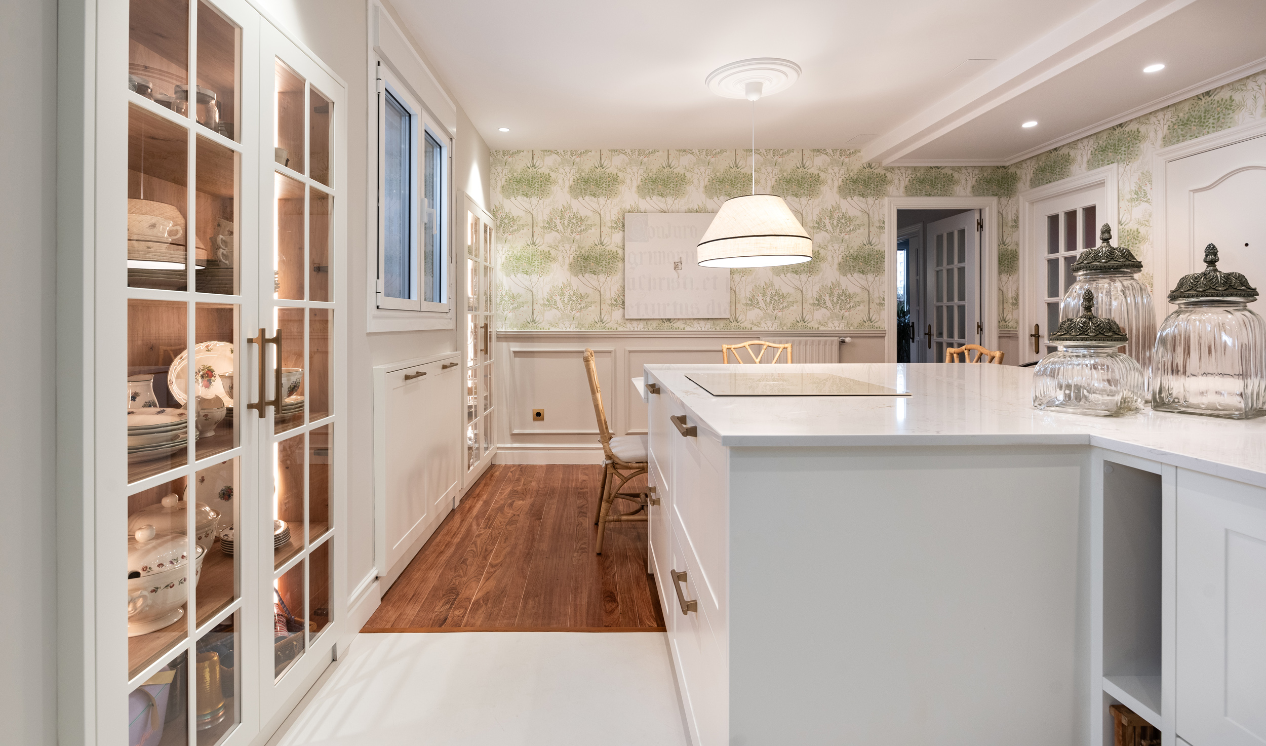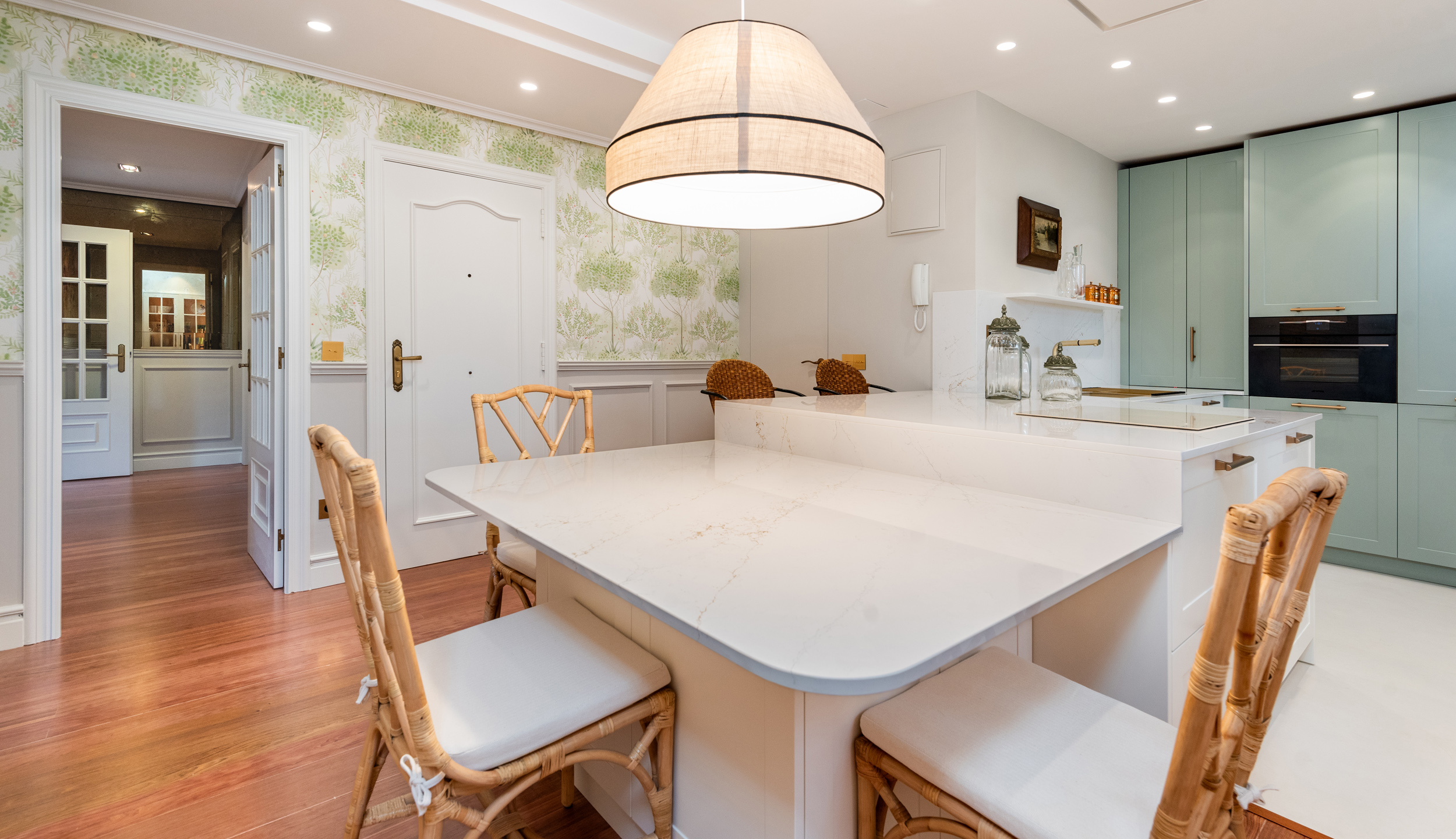 Esta es una reforma realizada con mucho esmero, en el ático de un edificio emblemático del centro de la ciudad, del 1.913 data. Se ha ganado espacio y luminosidad a una cocina, que era un espacio muy reducido e incómodo para el cliente. Se han recuperado los suelos de parquet totalmente, al igual que las piezas empotradas de almacenamientos. El resultado final de las combinaciones de materiales y colores seleccionados ha sido muy interesante por la calidad, alegría y armonía que han aportado a la vivienda, en combinación con lo que se ha mantenido. Los lacados, micro-cementos, piedras y papeles utilizados le han dado una nueva vida a este ático tan estupendo, siendo todo un éxito para el cliente, lo que nos alegra enormemente. Se ha buscado una estética clásica, pero renovada y fresca, a la vez que elegante y funcional. Todos los requisitos se han cumplido, y se continuará aportando con textiles renovados para seguir esta línea que tan buenos resultados está dando a esta vivienda…