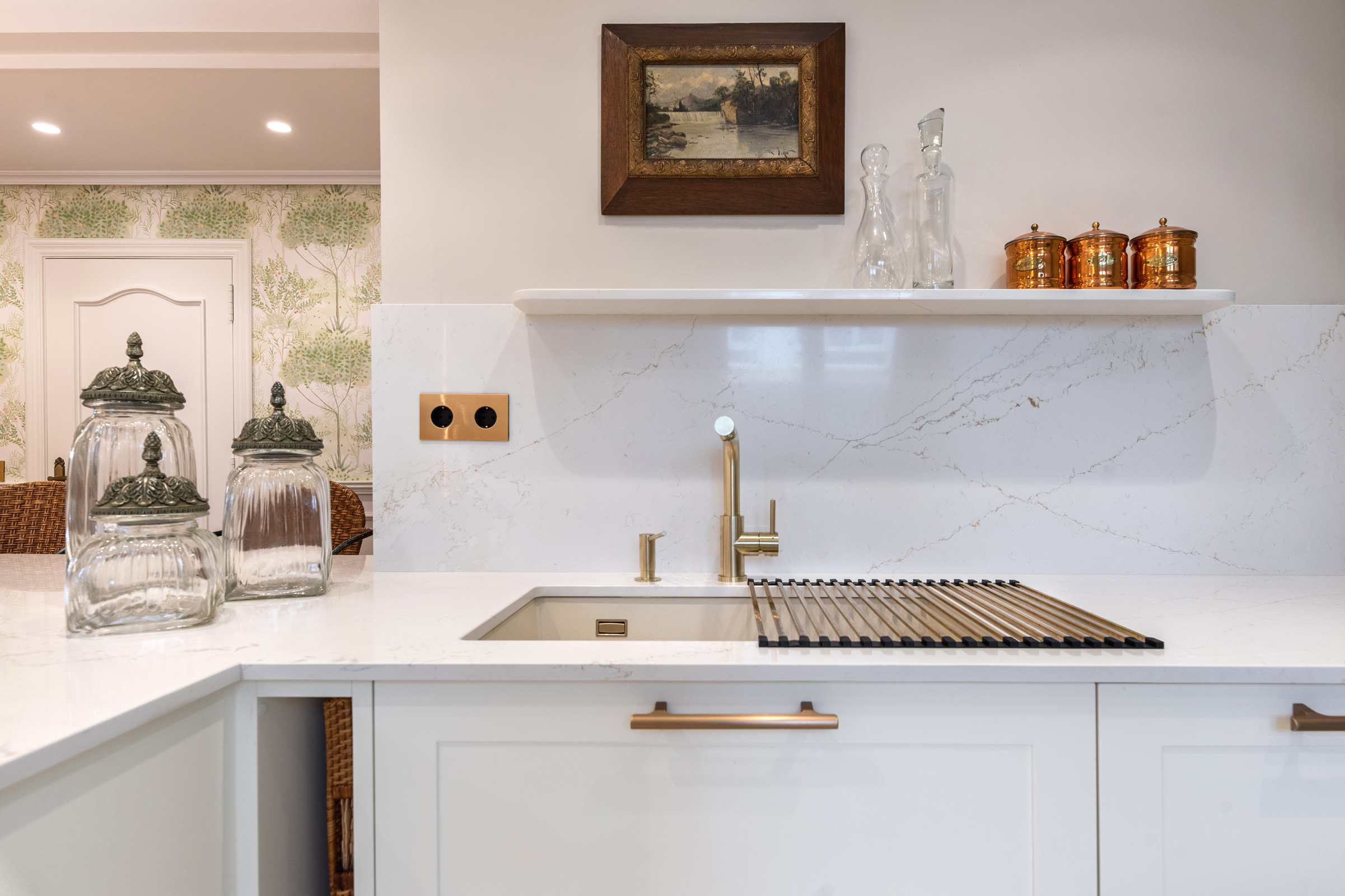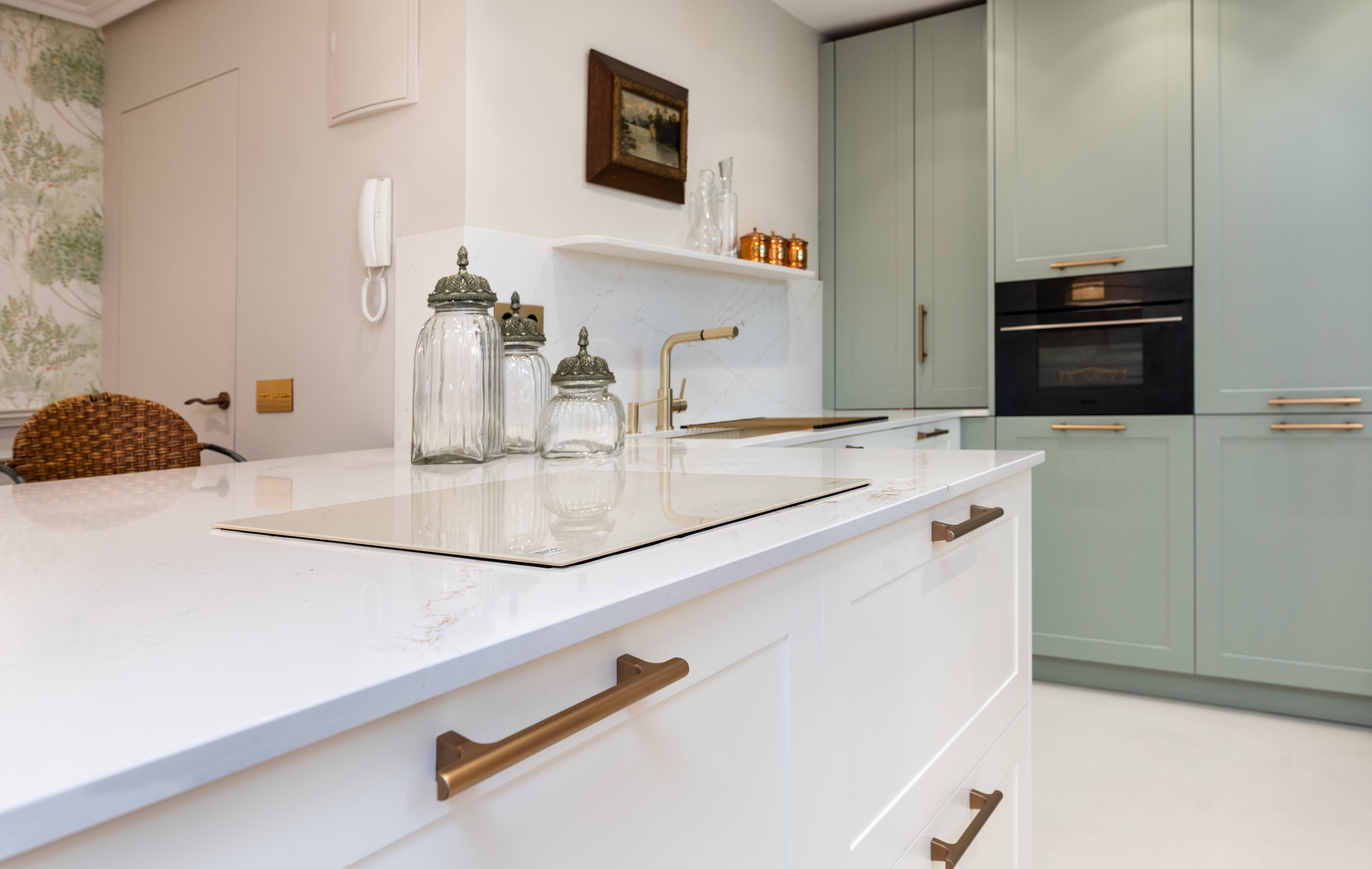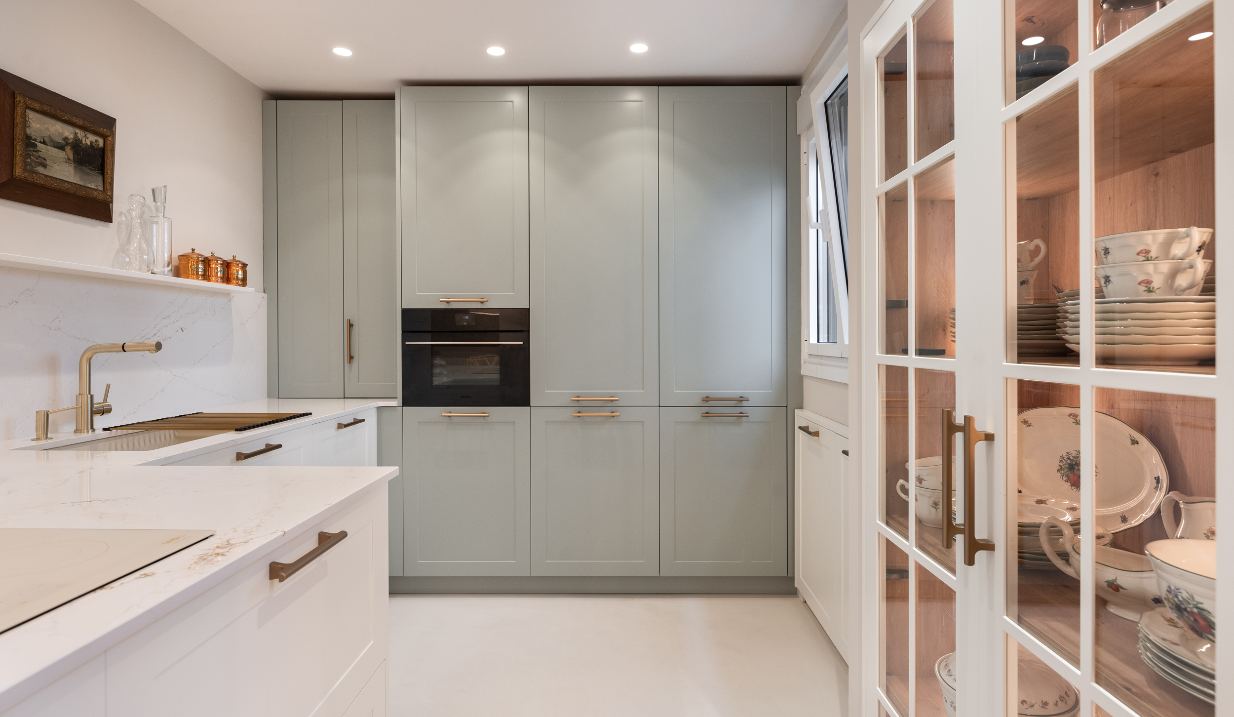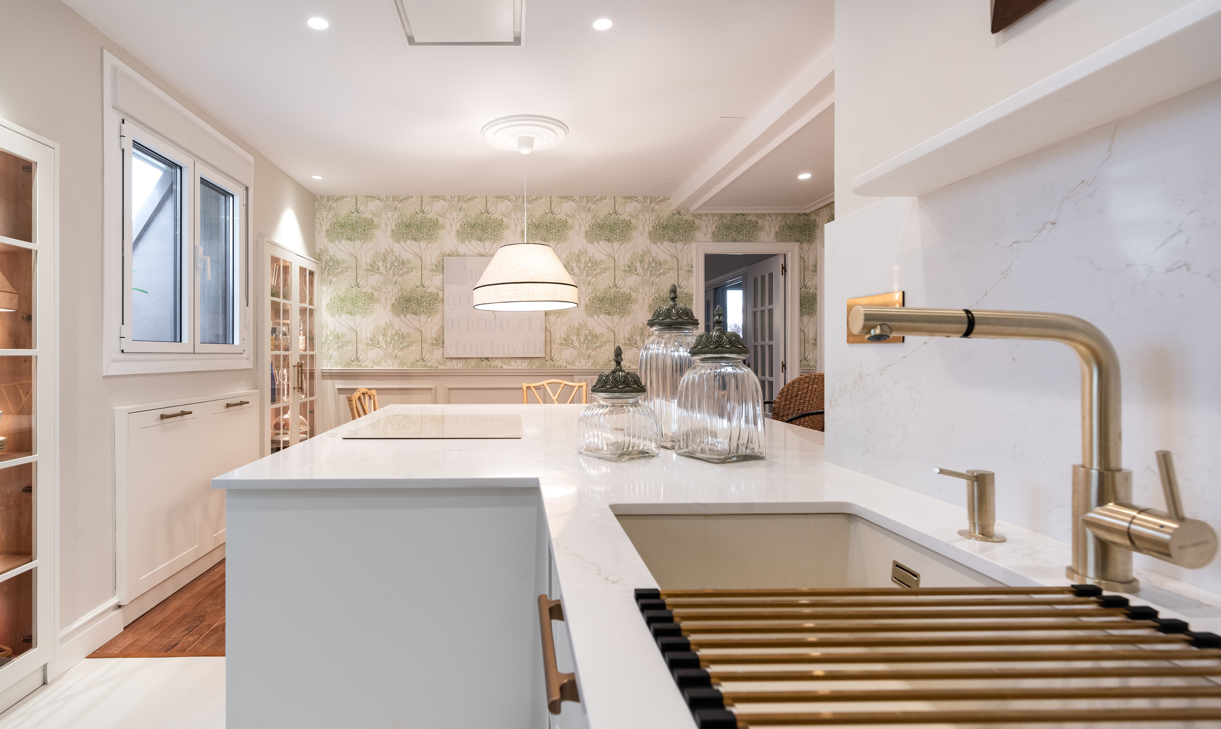 Esta es una reforma realizada con mucho esmero, en el ático de un edificio emblemático del centro de la ciudad, del 1.913 data. Se ha ganado espacio y luminosidad a una cocina, que era un espacio muy reducido e incómodo para el cliente. Se han recuperado los suelos de parquet totalmente, al igual que las piezas empotradas de almacenamientos. El resultado final de las combinaciones de materiales y colores seleccionados ha sido muy interesante por la calidad, alegría y armonía que han aportado a la vivienda, en combinación con lo que se ha mantenido. Los lacados, micro-cementos, piedras y papeles utilizados le han dado una nueva vida a este ático tan estupendo, siendo todo un éxito para el cliente, lo que nos alegra enormemente. Se ha buscado una estética clásica, pero renovada y fresca, a la vez que elegante y funcional. Todos los requisitos se han cumplido, y se continuará aportando con textiles renovados para seguir esta línea que tan buenos resultados está dando a esta vivienda…